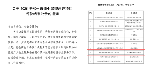 近日,鄭州市物業(yè)管理協(xié)會(huì)官網(wǎng)發(fā)布《關(guān)于2025年鄭州市物業(yè)管理示范項(xiàng)目評(píng)價(jià)結(jié)果公示的通知》,城發(fā)·金岱智慧產(chǎn)業(yè)園獲評(píng)“鄭州市物業(yè)管理示范項(xiàng)目”。