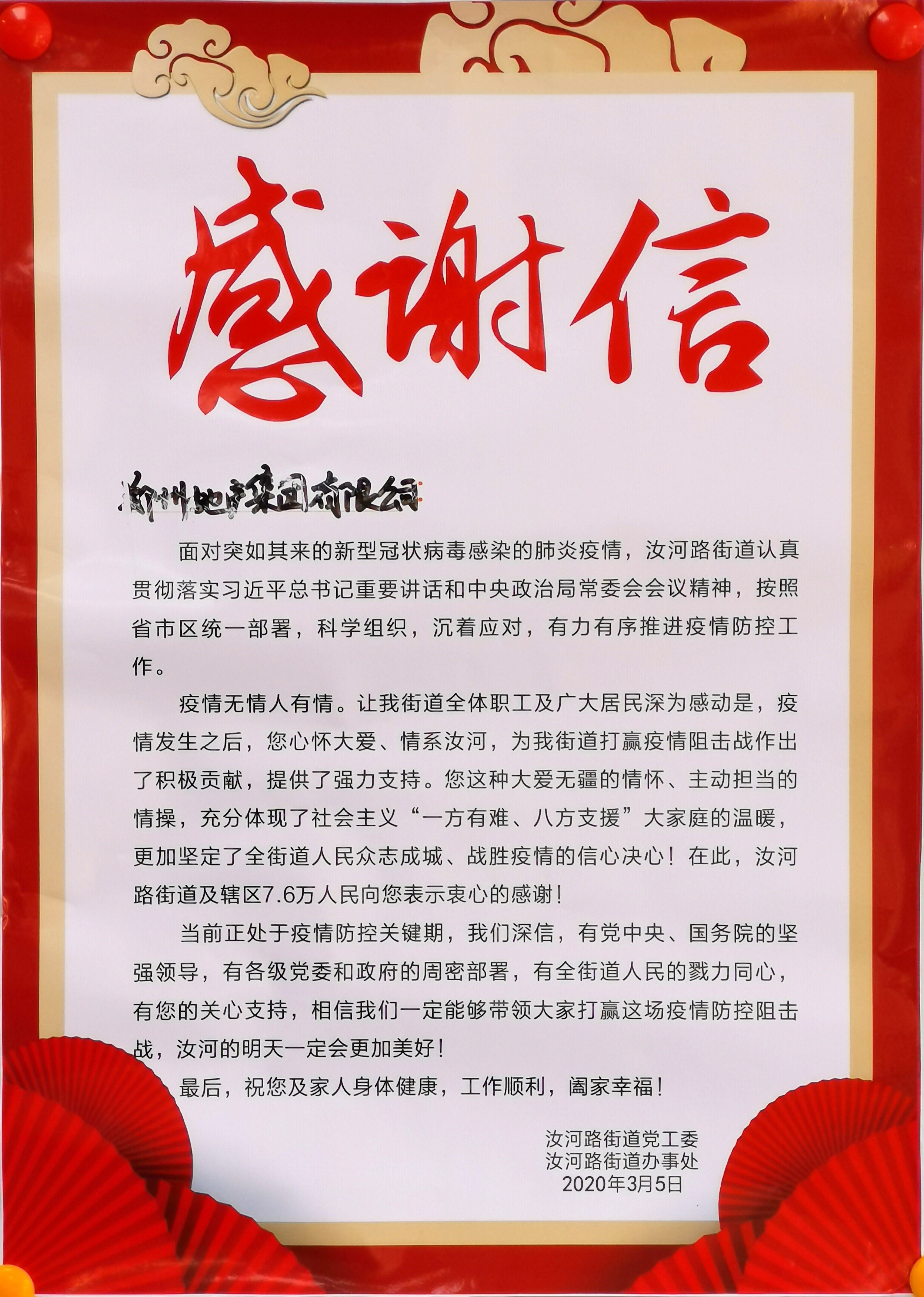 桐淮社區(qū)書記王輝代表社區(qū)工作人員和志愿者向集團(tuán)領(lǐng)導(dǎo)送上《感謝信》,并表示集團(tuán)的慰問讓一線工作人員心里充滿了溫暖,也進(jìn)一步堅(jiān)定了開展疫情防控的信心和決心。在地產(chǎn)集團(tuán)等社會(huì)各界的關(guān)心關(guān)注下,在無數(shù)雷鋒式志愿者的共同努力下,我們一定會(huì)打贏新冠肺炎疫情防控這場(chǎng)硬仗。